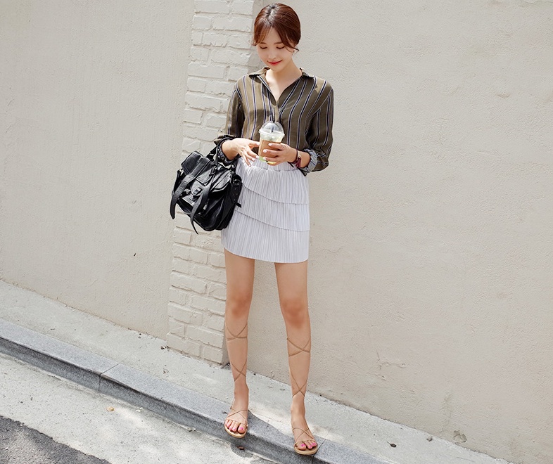 | Áo kẻ cá tính cũng trở nên điệu đà khi mix kèm váy ngắn. |