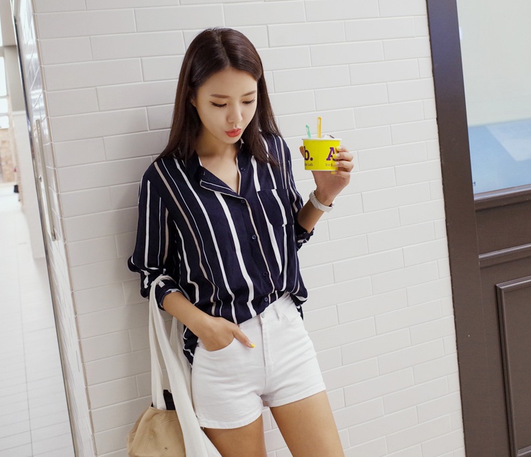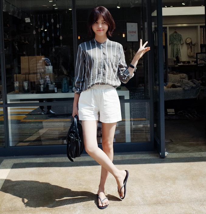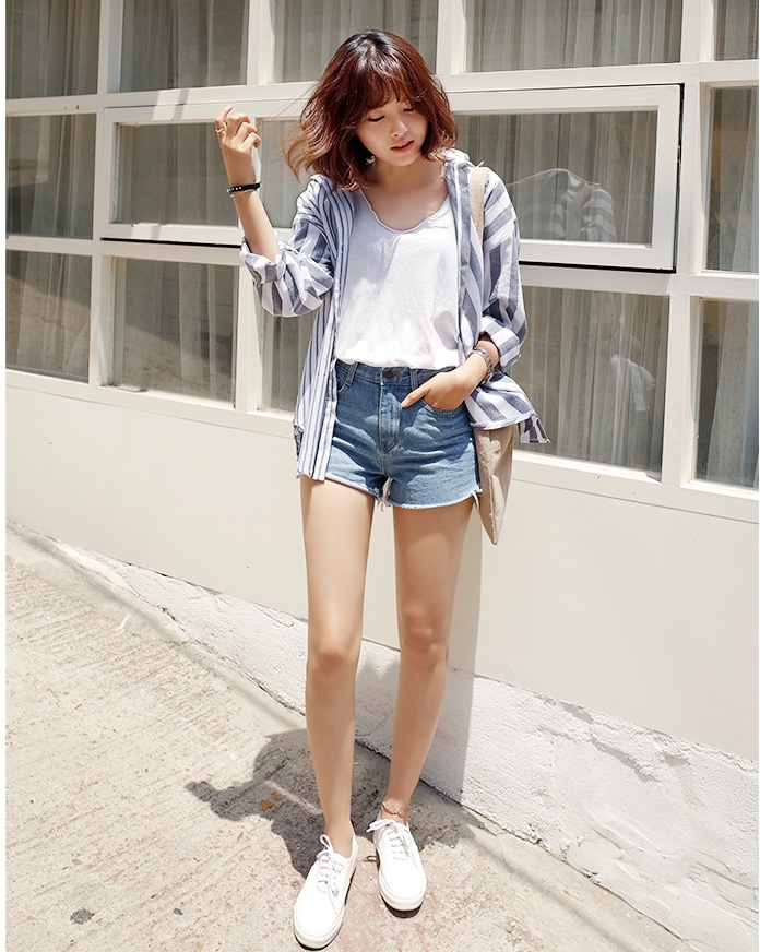 | Với sơ mi kẻ dáng rộng, bạn có thể mix kèm giày thể thao và quần shorts trẻ trung. |