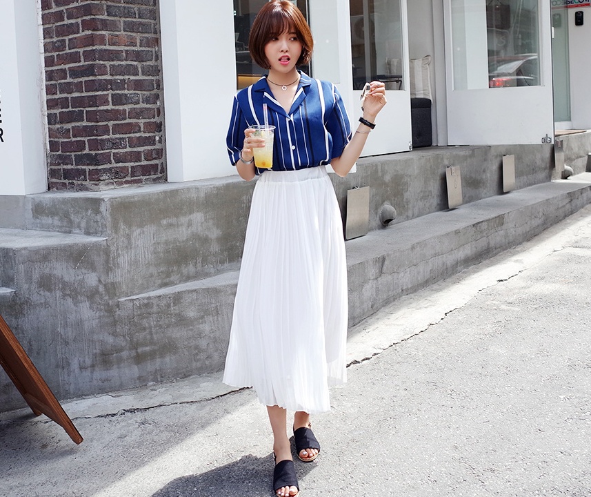 | Mẫu sơ mi kẻ mix kèm váy midi hết sức đáng yêu cho bạn gái nữ tính. |