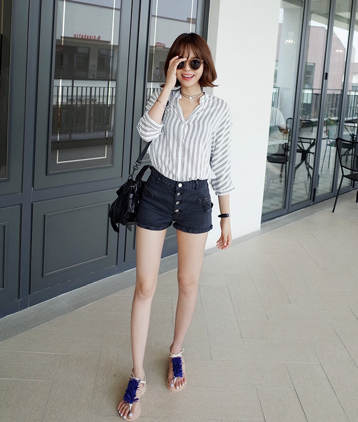 | Shorts jeans rách mix kèm áo sơ mi kẻ trẻ trung giúp bạn thêm năng động. |