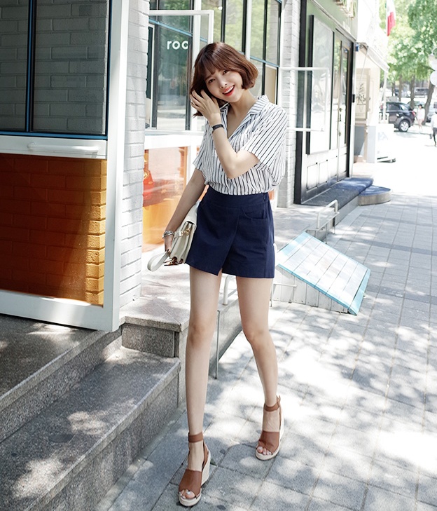 | Mẫu sơ mi kẻ mix kèm quần shorts và giày sneaker trắng giúp bạn thêm trẻ trung. |