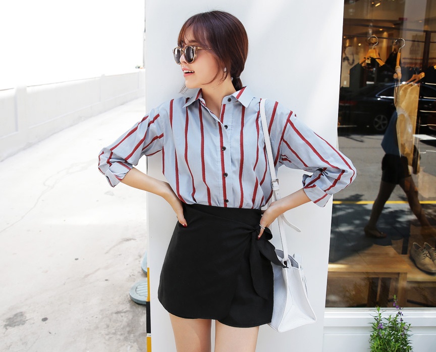 | Gợi ý trẻ trung cho dân công sở với mẫu quần váy và sơ mi kẻ. |