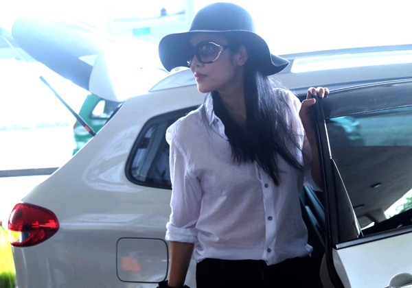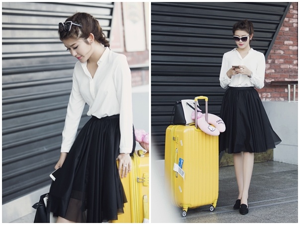 | Á hậu Huyền My diện sơ-mi trắng cùng chân váy xếp ly nổi bật một góc sân bay Tân Sơn Nhất. |