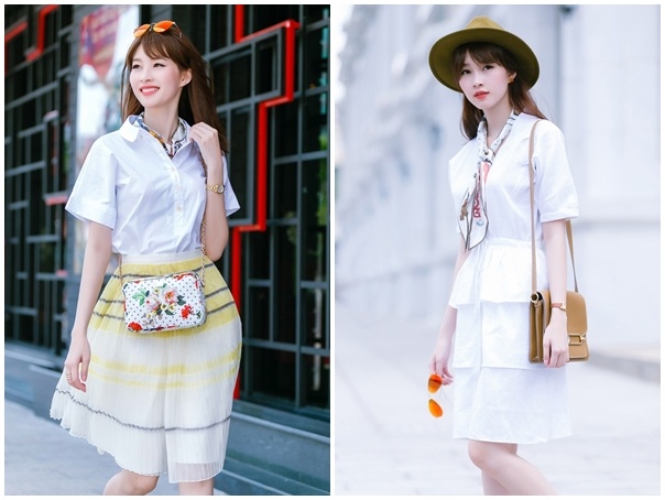 Kiểu mốt áo truyền thống gam màu trắng tinh khiết dễ dàng phối phụ kiện được nhiều sao nữ ưa chuộng, ứng dụng vào mùa hè.