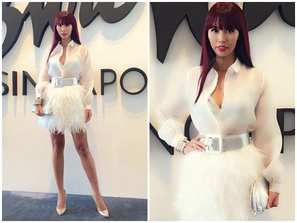 | Tham dự một sự kiện tại Singapore vào trung tuần tháng 5, Hà Anh chọn mốt áo sơ-mi voan trắng, để lộ nội y gợi cảm. |