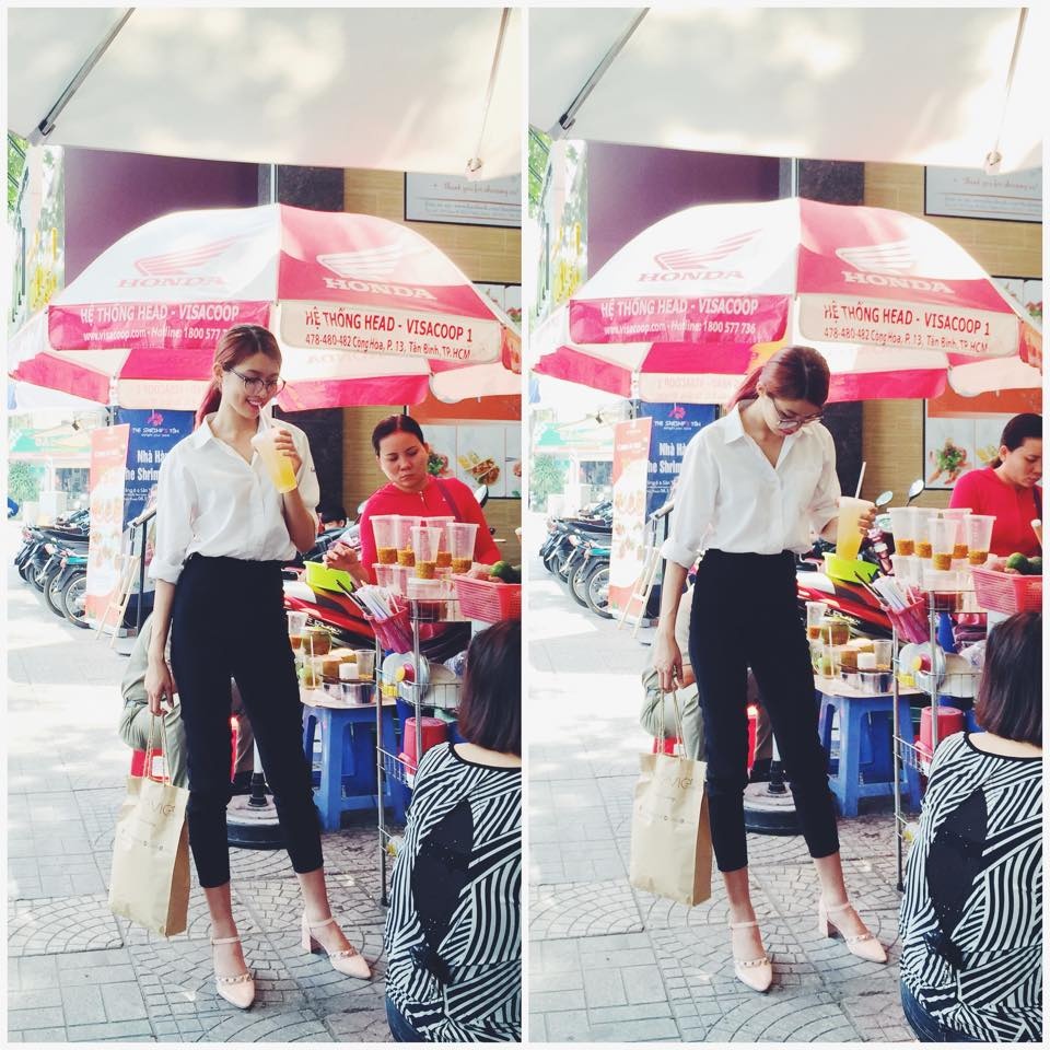 | Quỳnh Châu Next Top Model mix áo sơ-mi trắng cùng quần lưng cao khoe vóc dáng cân đối, quyến rũ khi tản bộ trên đường phố Sài thành. |