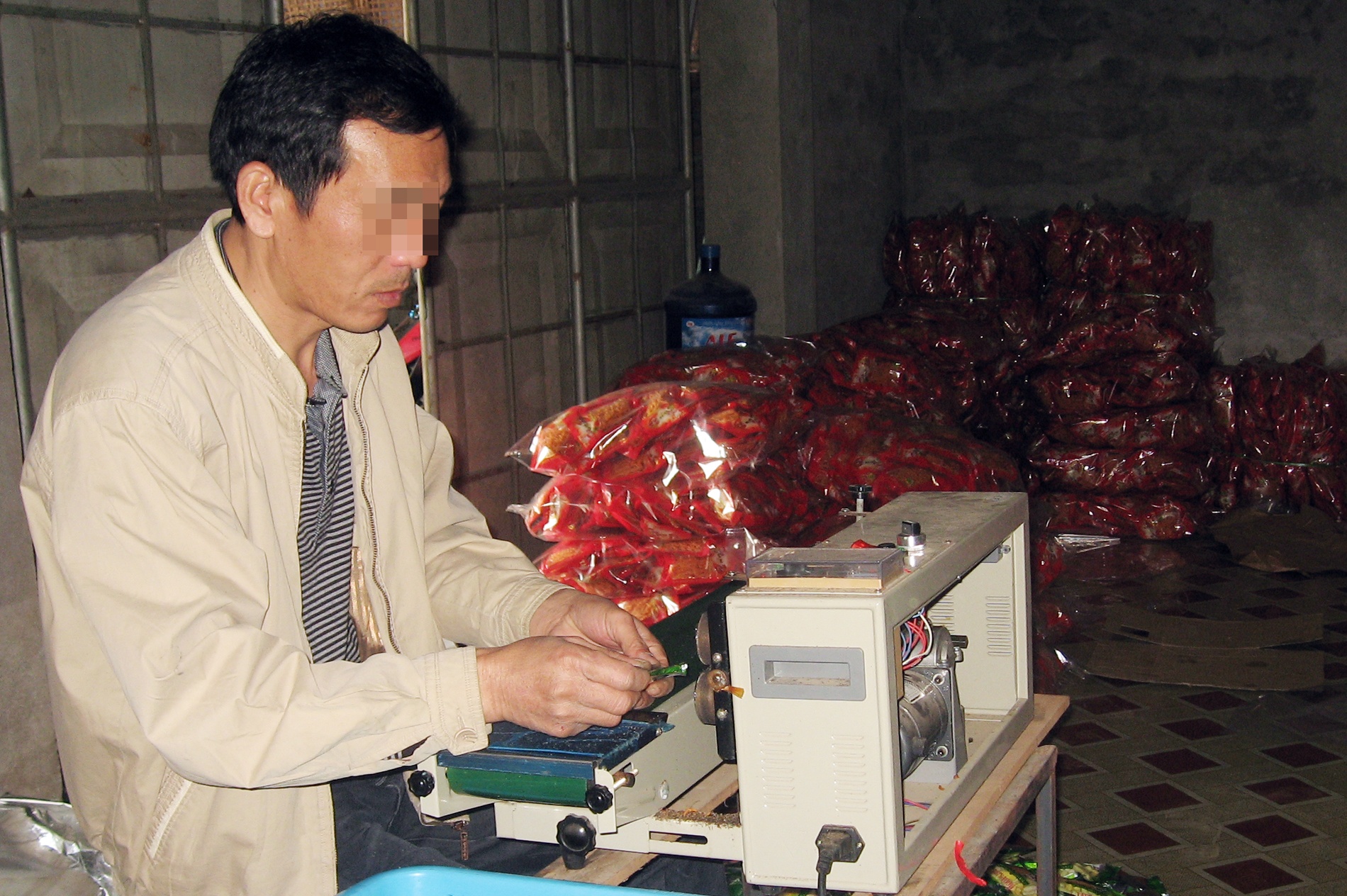 | Một người Trung Quốc sản xuất bim bim với các phụ gia, hóa chất không nguồn gốc. Ảnh: Việt Đức. |