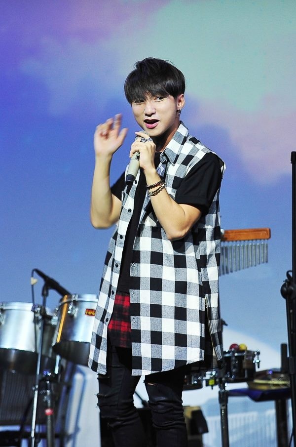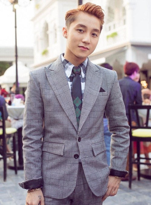 | Phong cách của nam ca sỉ sinh năm 1994 chững chạc hơn nhờ trang phục suits ô kẻ cổ điển. Mái tóc clean cut màu cam làm điểm nhấn phá cách. |