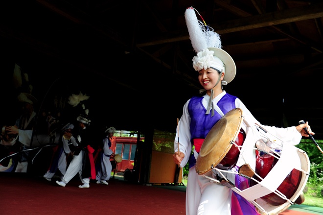 | Các chương trình nghệ thuật mang đậm nét văn hóa dân gian Hàn Quốc được biểu diễn liên tục trong ngày phục vụ khách tham quan. |
