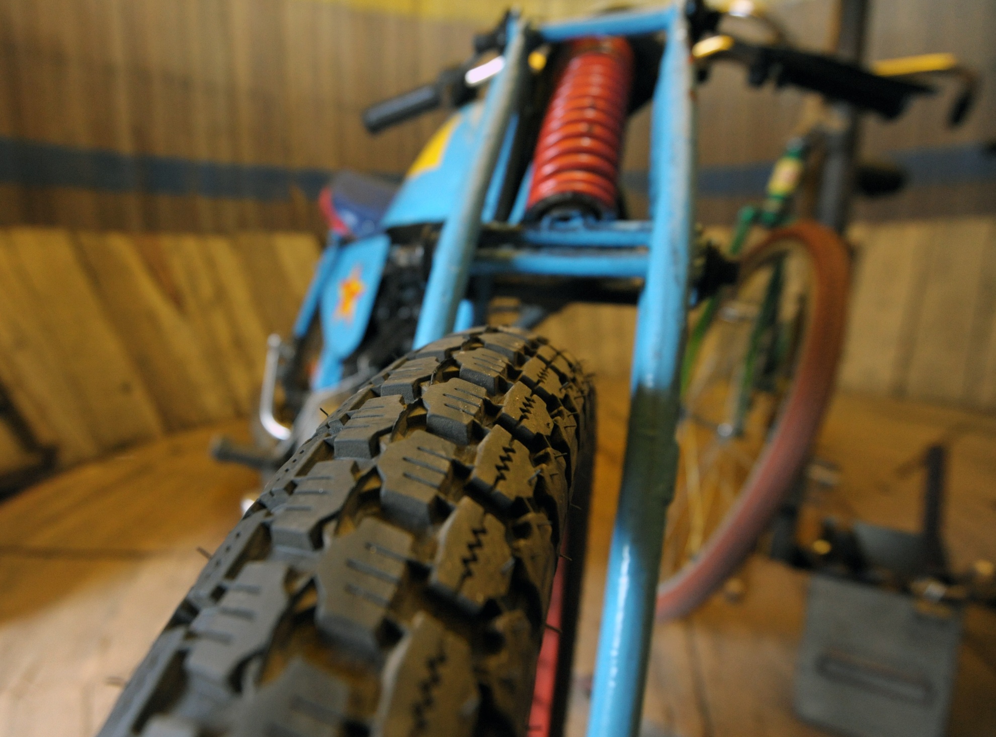 | Khung xe được gia cố lại để phù hợp với bộ giảm xóc đơn phía trước. Lốp luôn được thay mới để đảm bảo độ ma sát khi thực hiện những động tác khó. Trọng lượng của những chiếc xe này khoảng 130 kg.