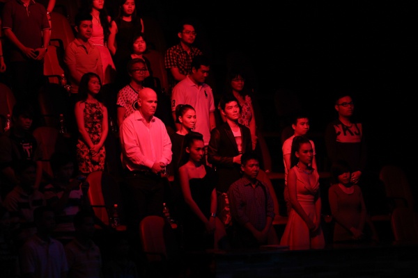| Toàn thể khán giả đứng lên để tưởng nhớ Đại tướng Võ Nguyên Giáp. |