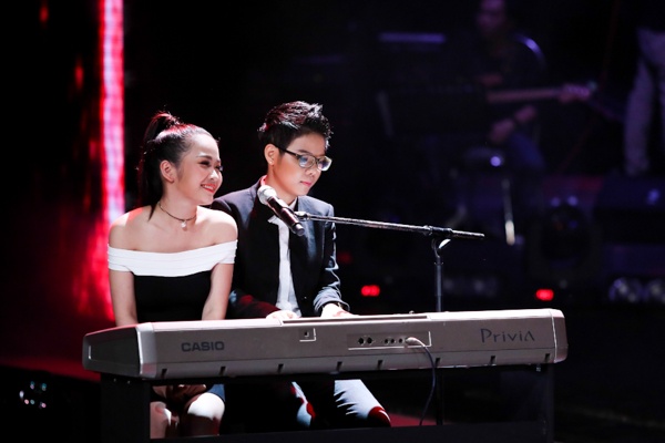 | Vũ Cát Tường cũng biểu diễn đàn organ. Bên cạnh cô gái tomboy là gà cưng của Đàm Vĩnh Hưng - Ngọc Trâm. |