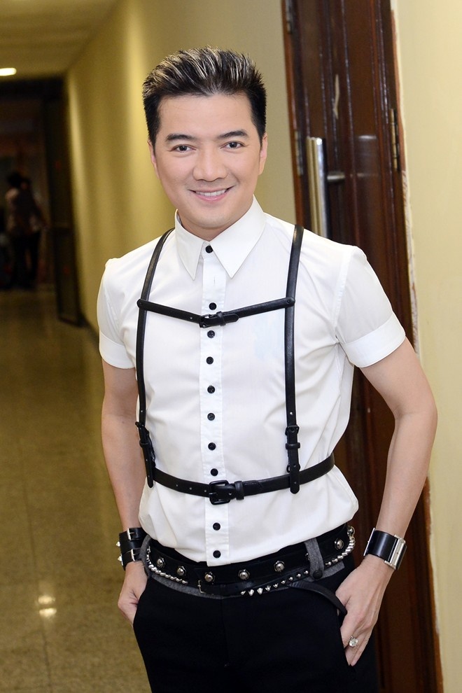 Dây đeo táo bạo rất được nhiều nghệ sĩ thế giới ưa chuộng được Đàm Vĩnh Hưng ứng dụng hiệu quả, phù hợp vóc dáng người mặc. Cách chọn tông màu trắng đen cũng rất sang trọng, làm nổi bật phụ kiện thắt lưng, vòng tay...