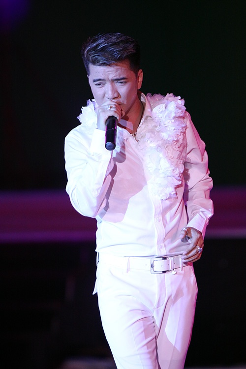Những bông hoa vải xinh xắn được kết trên trang phục đồng màu, tạo sức hút cho người mặc, giúp anh tự tin trên sân khấu.