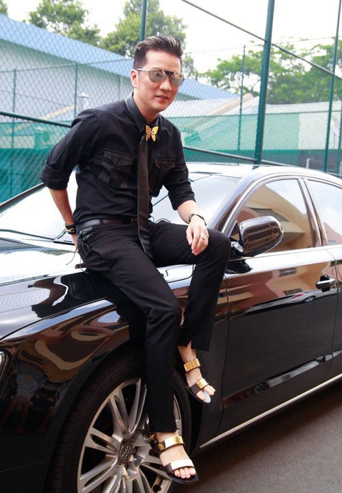 Để thể hiện hình ảnh độc đáo, Đàm Vĩnh Hưng không ngại chi tiền để sử hữu những phụ kiện lạ mắt, có một không hai. Chiếc cravat chất liệu kim loại trở thành điểm nhấn đắt giá trên trang phục tối màu.