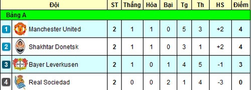 Dù Quỷ đỏ khởi động ì ạch ở Premier League, nhưng HLV David Moyes lại nhận được điểm cộng tại Champions League khi giúp CLB chủ sân Old Trafford giành kết quả không quá tệ, thu về 4 điểm sau 2 trận (thắng Leverkusen 4-1 trên sân nhà và hòa 1-1 trước Shakhtar trên sân đối phương) giúp MU dẫn đầu bảng A trước khi bước vào lượt trận thứ 3.