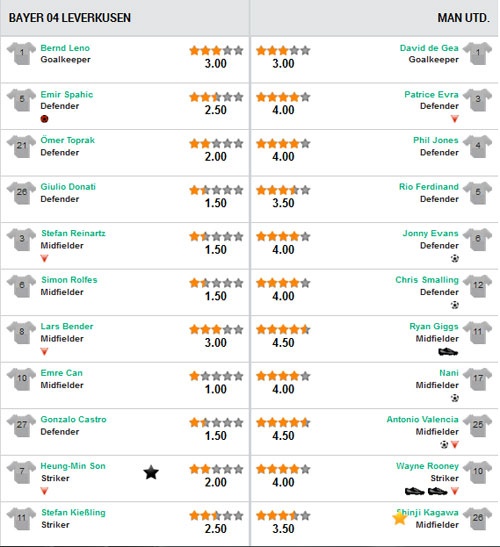 Điểm của cầu thủ ra sân trong đội hình chính trận Leverkusen - MU