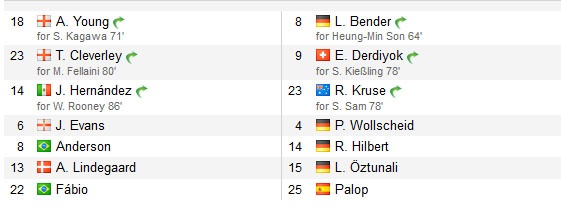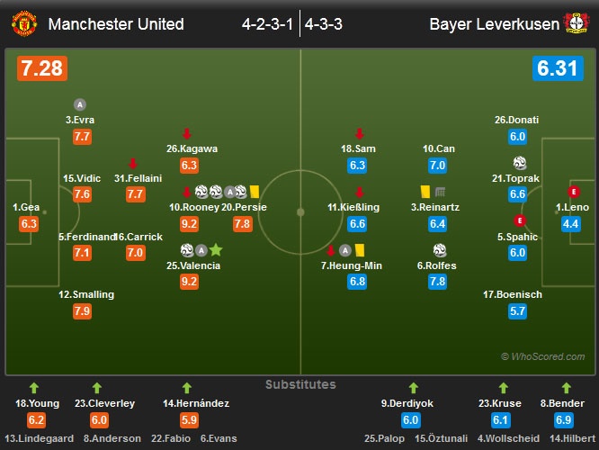 Khác với việc bố trí sơ đồ chiến thuật 4-2-3-1 ở những trận đấu tại giải Ngoại hạng Anh, MU đón tiếp Leverkusen trong trận ra quân vòng bảng Champions League với đội hình 4-4-2. Thể hiện được phong độ tốt khi trở lại sau chấn thương, Wayne Rooney được HLV David Moyes xếp đá cặp cùng Van Persie trên hàng công. Ở trận này, tân binh Fellaini (tiền vệ trung tâm) và Shinji Kagawa (lệch trái) ra sân từ đầu và góp phần giúp Quỷ đỏ có thế trận vượt trội so với Leverkusen khi có thời gian kiểm soát bóng lên tới 61% trong hiệp 1.