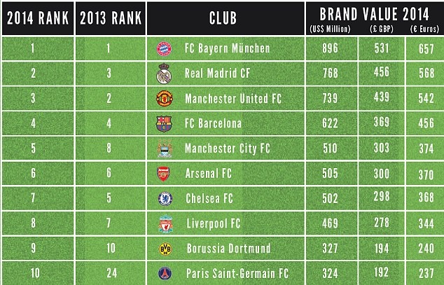 | Top 10 đội bóng có giá trị thương hiệu lớn nhất thế giới. Ảnh: Daily Mail |