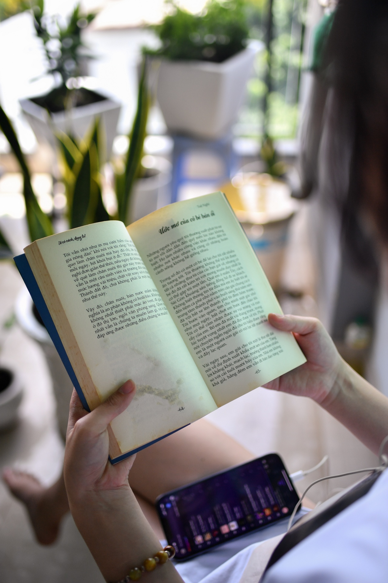 | Tôi thường tranh thủ thời gian buổi trưa để ngủ một chút. Sau đó, tôi tận hưởng không gian đầy cây xanh của ông nội trên sân thượng với âm nhạc và đọc một cuốn tản văn. Cuốn sách hôm nay tôi đọc là “Sẽ có cách đừng lo!”. |