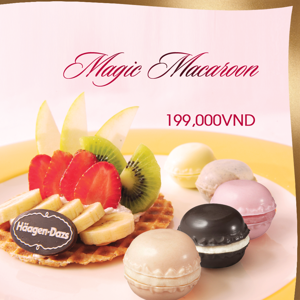 So với truyền thống, bánh macaroon tại đây được gọi là bánh macaroon kem lạnh khi được cách tân với lớp vỏ bánh làm từ chocolate, nhân kem lạnh bên trong và lớp kem tươi kẹp giữa với nhiều vị khác nhau. Thực khách sẽ được thưởng thức bánh trong món kem Magic Macaroon thật đặc biệt với vị kem cookies và cream, va-ni, chocolate, macadamia nut, cùng với các loại trái cây tươi được đặt trên chiếc bánh waffle giòn rụm. Magic macaroon hiện được phục vụ với mức giá đặc biệt - 199.000 đồng.