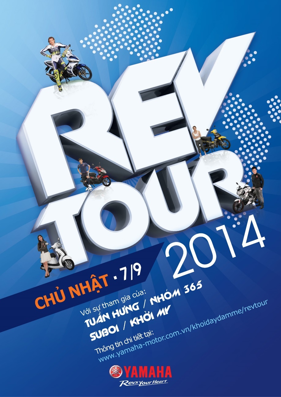 Cùng Yamaha tham gia bữa tiệc cuối cùng của mùa hè này với Yamaha Rev Tour để tận hưởng không khí sảng khoái và cực kỳ sôi động khi tham gia các trò chơi phù hợp mọi lứa tuổi. Đừng ngần ngại tham gia chương trình cùng gia đình, từ những chiếc xe máy mini dành cho trẻ em hay những trò vận động cần sự tiếp sức của các thành viên chắc chắn sẽ gắn kết mọi người gần nhau hơn. Đặc biệt hơn là không gian rộng lớn của quảng trường, bạn sẽ có cơ hội trải nghiệm chiếc xe dành cho tương lai - một bước tiến sáng tạo của nhãn hàng Yamaha.