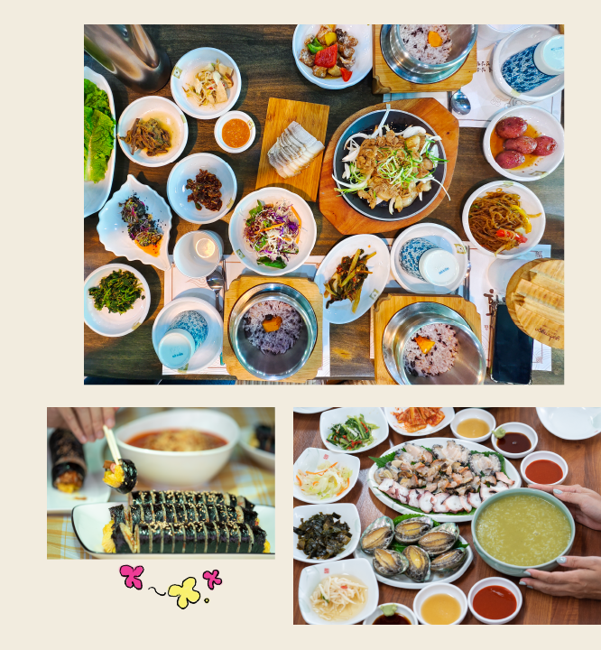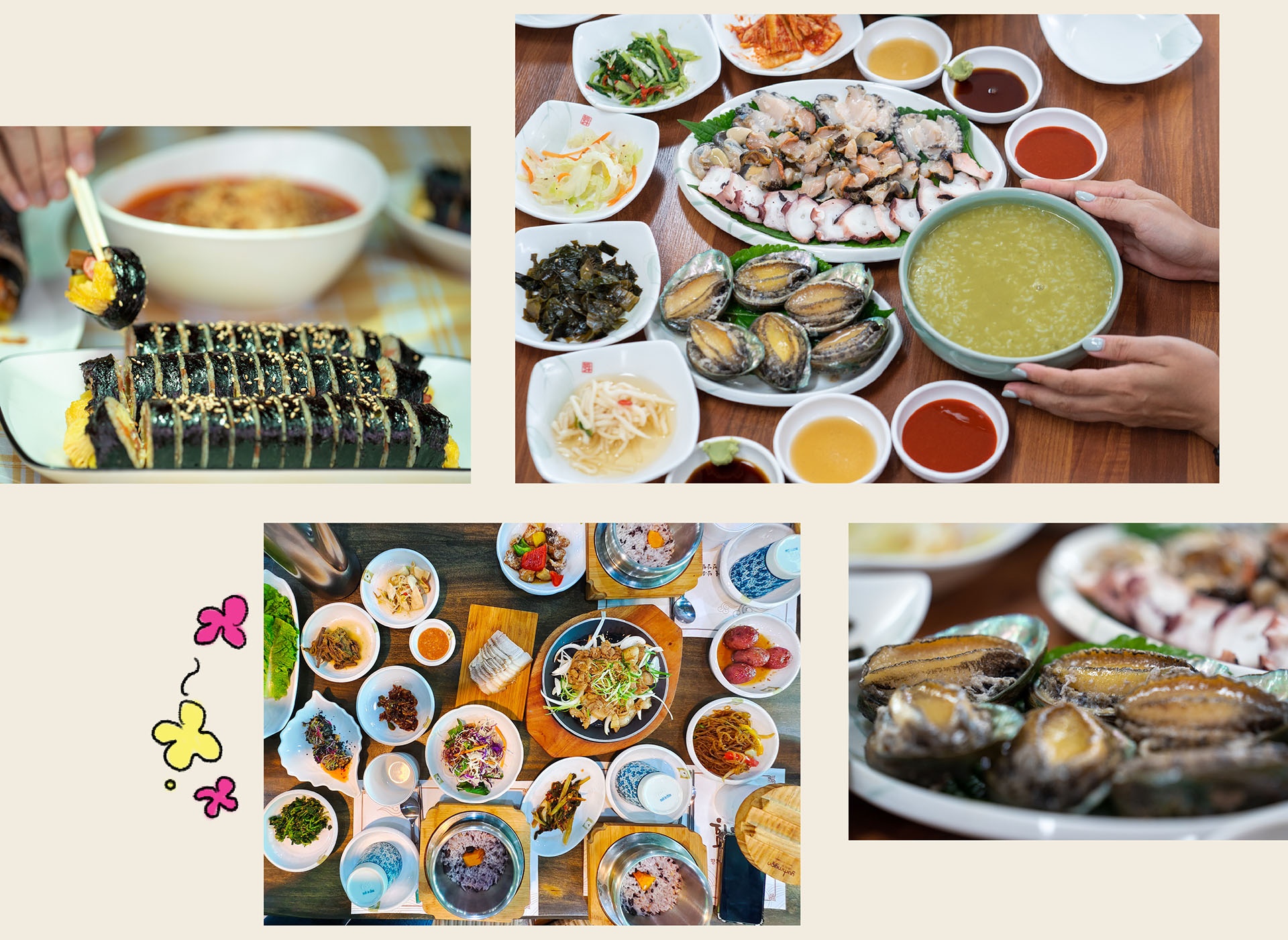 Trên đảo, tôi cũng có dịp trải nghiệm nhiều món ăn truyền thống của người Hàn Quốc. Trong đó, tôi ấn tượng nhất với một bàn ăn bày đủ loại kimbap, tteokbokki tại nhà hàng địa phương ấm áp, gần gũi.