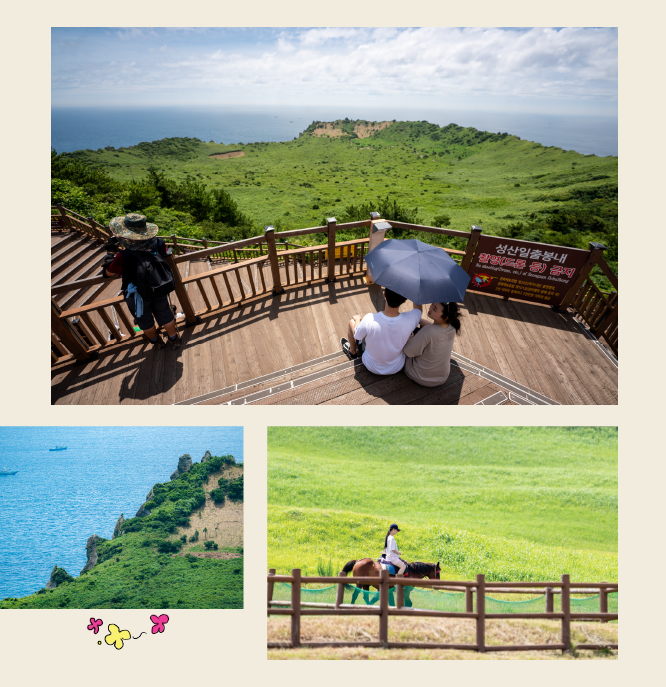 Đỉnh Seongsan Ilchulbong (hay còn gọi là đỉnh mặt trời mọc Seongsan), cao 180 m so với mực nước biển, đã phun trào dưới đáy đại dương cách đây khoảng 5.000 năm. Điều đó khiến địa danh này trở nên đặc biệt trong số rất nhiều miệng núi lửa ở đảo Jeju.