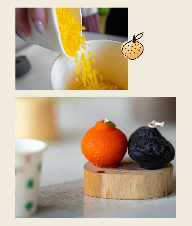 Hahyo Village vẫn thân thiện chào đón chúng tôi với người hướng dẫn bản địa. Tại đây, tôi tự tay tạo nên hai sản phẩm nến thơm nhỏ nhắn hình đá núi lửa và quýt Hallabong mang về làm quà. Workshop làm bánh tart quýt, bánh gạo quýt - đặc sản Jeju - cũng là trải nghiệm bạn nên thử khi đến đây.
