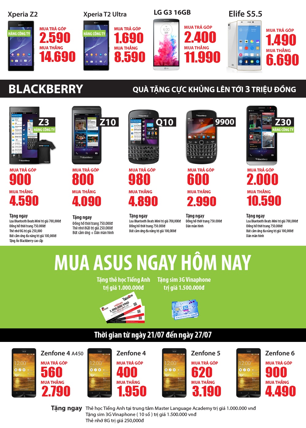 - BlackBerry Z3: 4,59 triệu đồng (Giá NY: 4,99 triệu đồng) cùng quà tặng hấp dẫn (Trả trước 850.000 đồng)