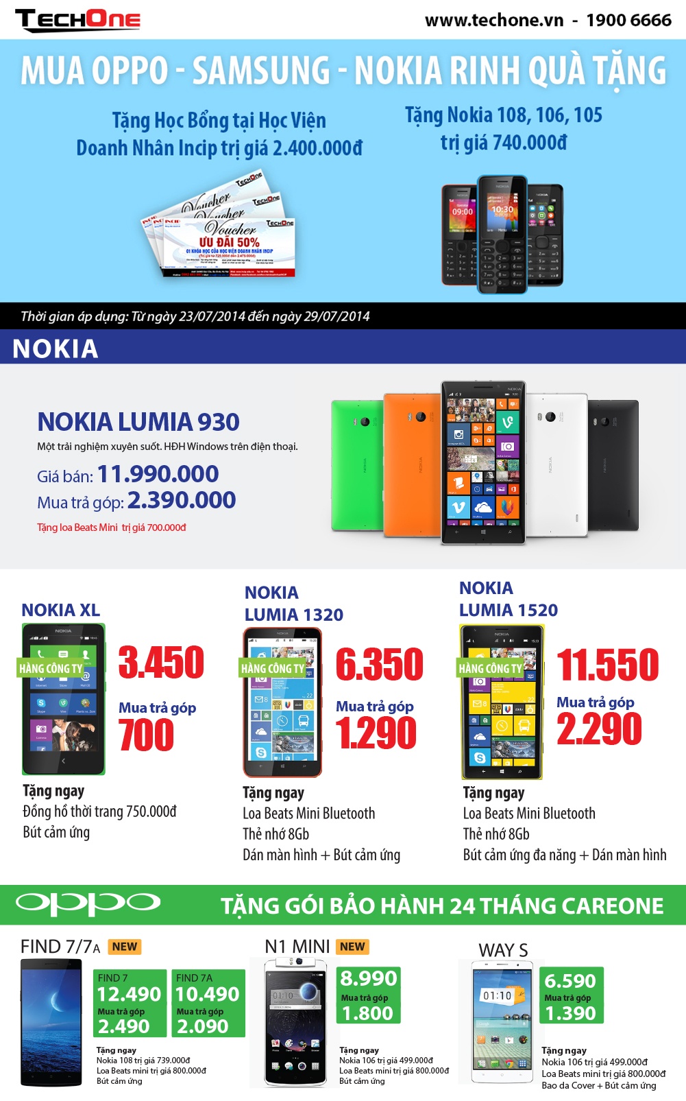 Từ 23/7-30/7 mua OPPO, Nokia, Samsung nhận ngay điện thoại Nokia 108 trị giá 740.000 đồng và nhận ngay học bổng trị giá 2,4 triệu đồng tại học viện doanh nhân - duy nhất tại TechOne