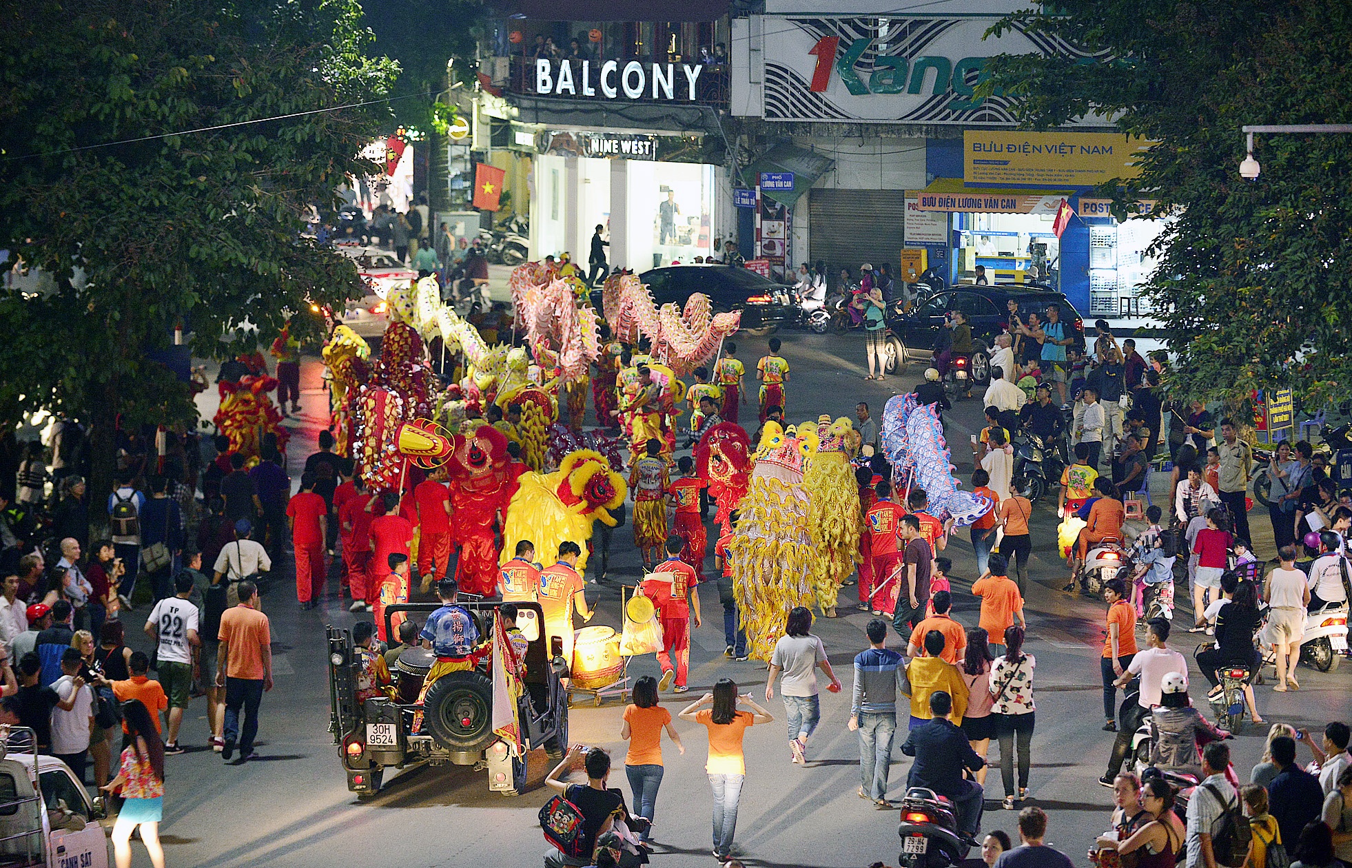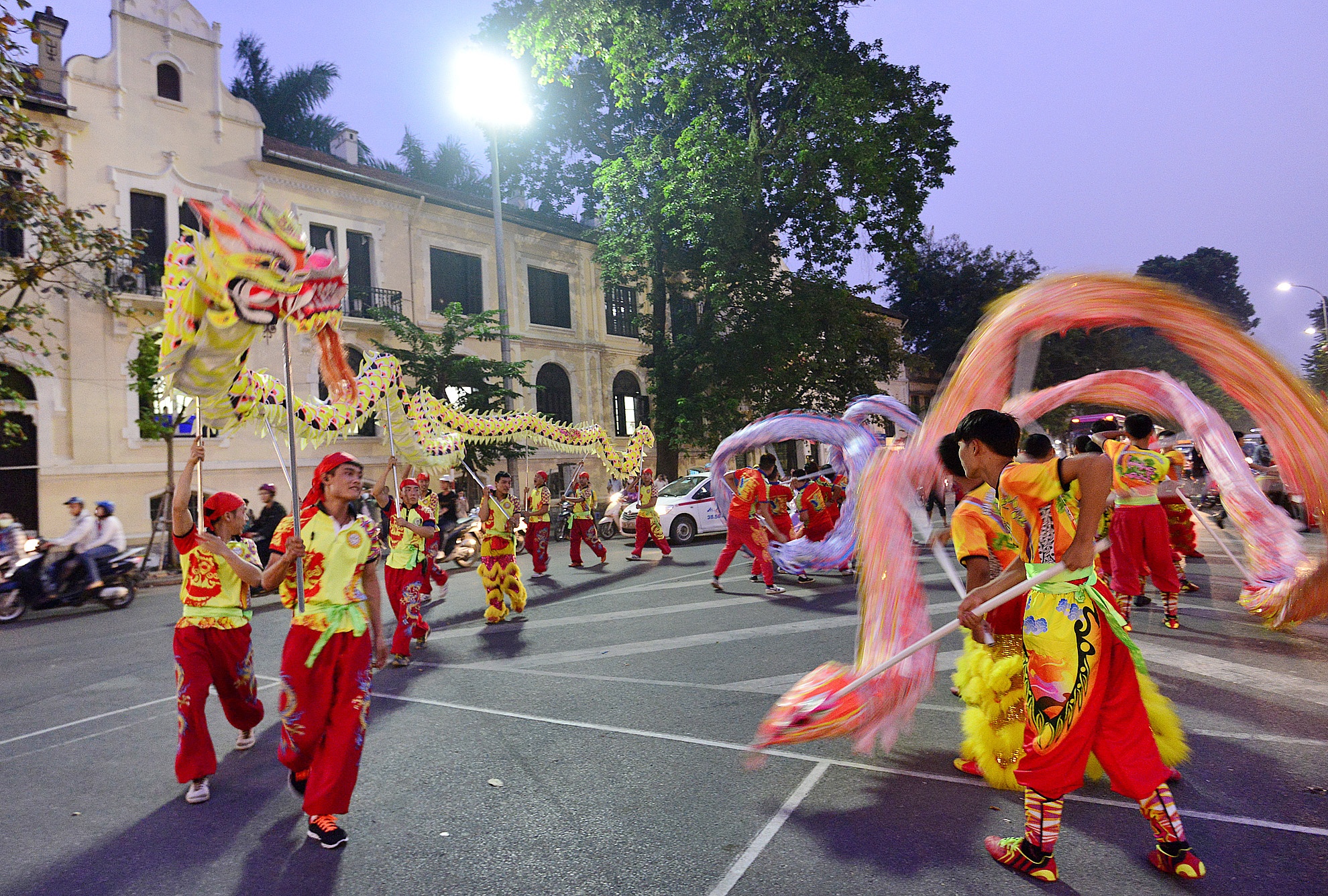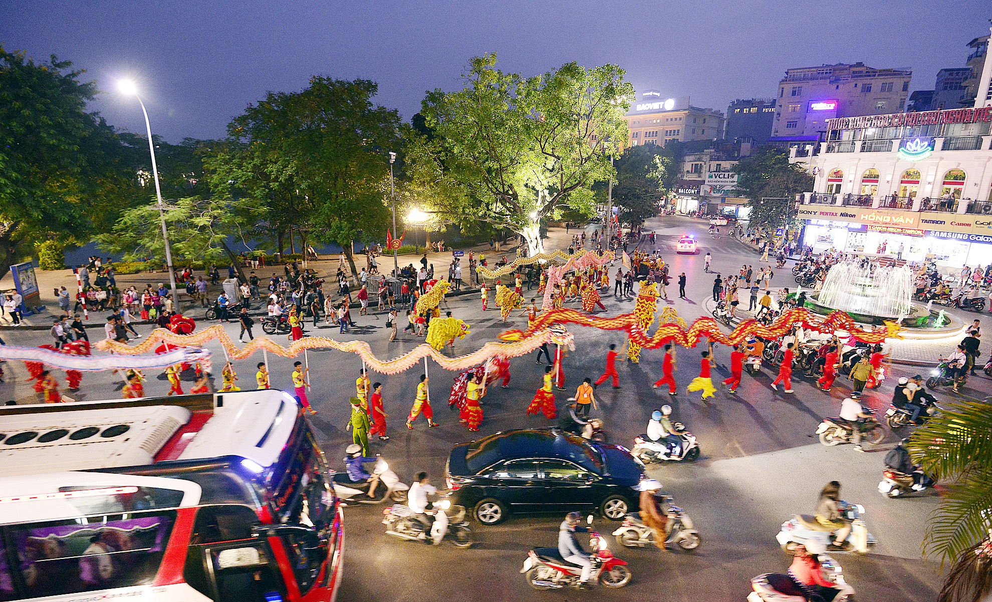 Các đội múa rồng diễu hành quanh hồ Hoàn Kiếm, ngang qua các tuyến phố Đinh Tiên Hoàng - Lê Thái Tổ - Bà Triệu.