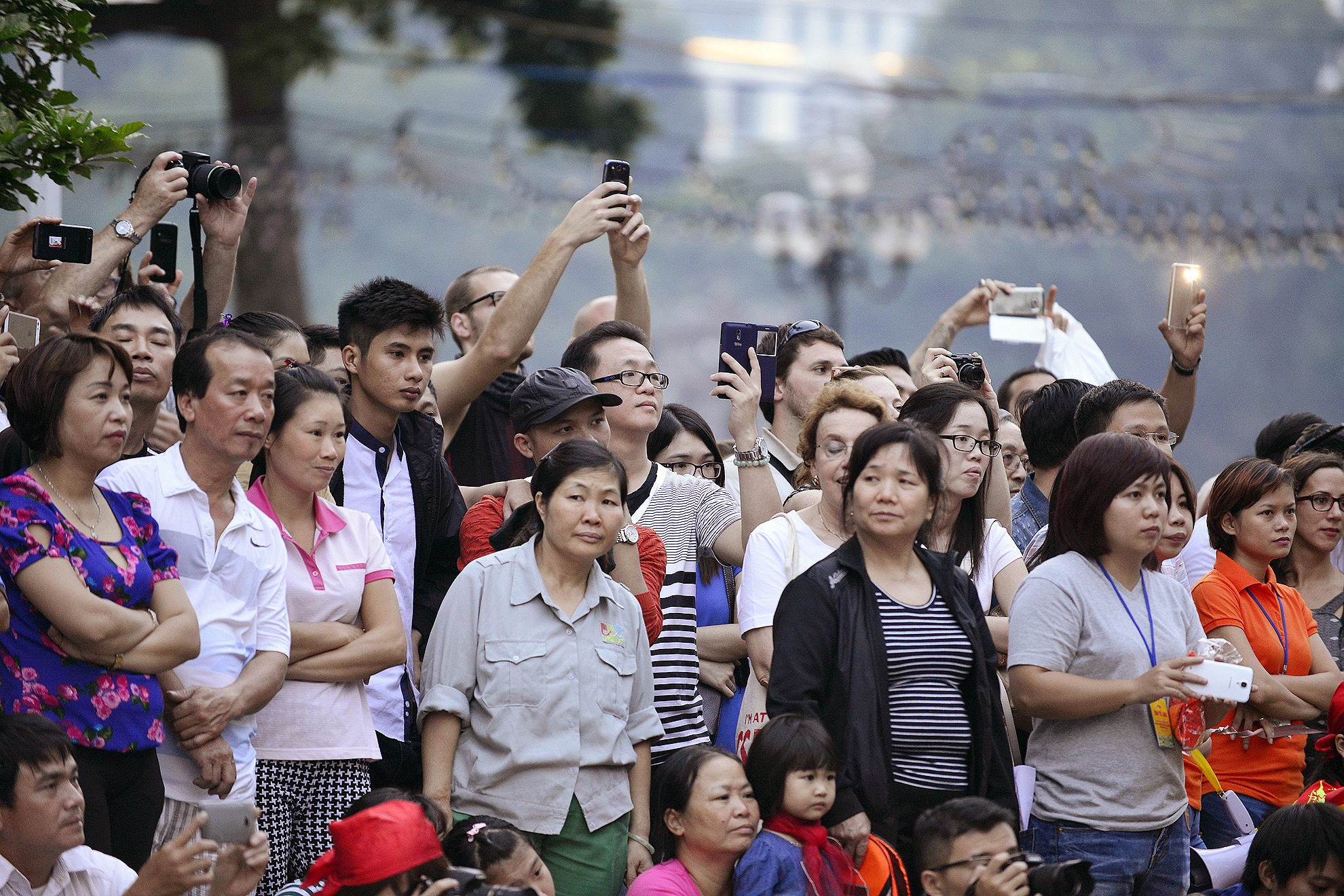 Hàng trăm khách du lịch có mặt tại hồ Gươm chăm chú theo dõi.