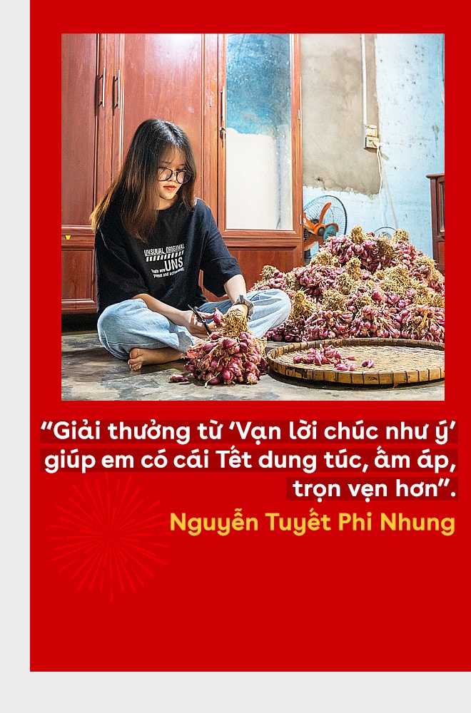 Vóc người nhỏ bé đầy rắn rỏi, Nguyễn Tuyết Phi Nhung - sinh viên năm 2 trường Cao đẳng Công Thương TP.HCM - bất ngờ khi mình là người đầu tiên trúng giải “Tết như ý” giá trị 100 triệu đồng khi tham gia “Vạn lời chúc như ý”. Sinh ra và lớn lên ở Đồng Nai, Phi Nhung đã sớm tự lập, vừa đi học vừa đi làm để trang trải cuộc sống xa nhà.