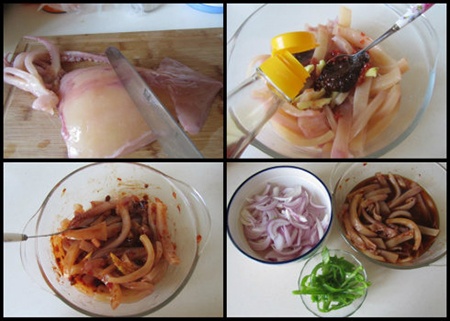 Rửa sạch mực, để ráo, cắt thành các dải mỏng. Đặt mực vào bát trộn, sau đó thêm nước tương, tương ớt, tỏi, gừng, rượu nấu ăn và muối, trộn đều và ướp khoảng 1 giờ. Trong lúc chờ ướp mực, thái sẵn hành tây và ớt xanh.
