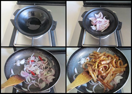 Đặt một chảo gang sâu lòng lên bếp, cho một chút dầu vào chảo rồi xào qua hành tây, giữ lại một nửa hành tây trong chảo gang. Dùng một chảo khác xào hành tây cùng ớt đỏ, khi hành tây mềm, trút mực vào chảo xào cùng, giữ lại phần nước.