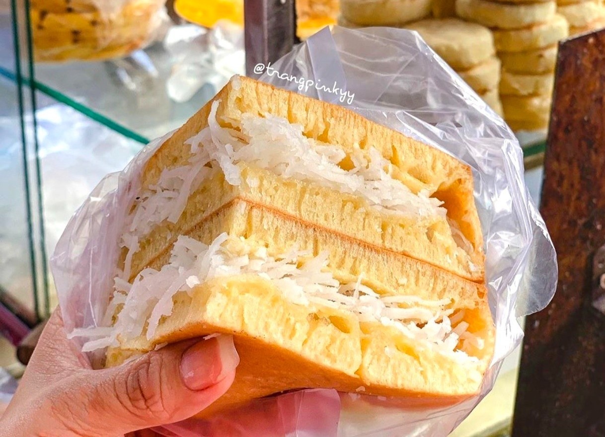 Bánh bò dừa gợi nhớ hương vị tuổi thơ với tín đồ ẩm thực. Món ăn nổi bật nhờ nước cốt dừa quyện bột bánh và nhân dừa nạo béo ngậy. Lớp vỏ bánh được nướng lò than nên vàng đều và giòn rụm. Ảnh: Trangpinkyy. |
