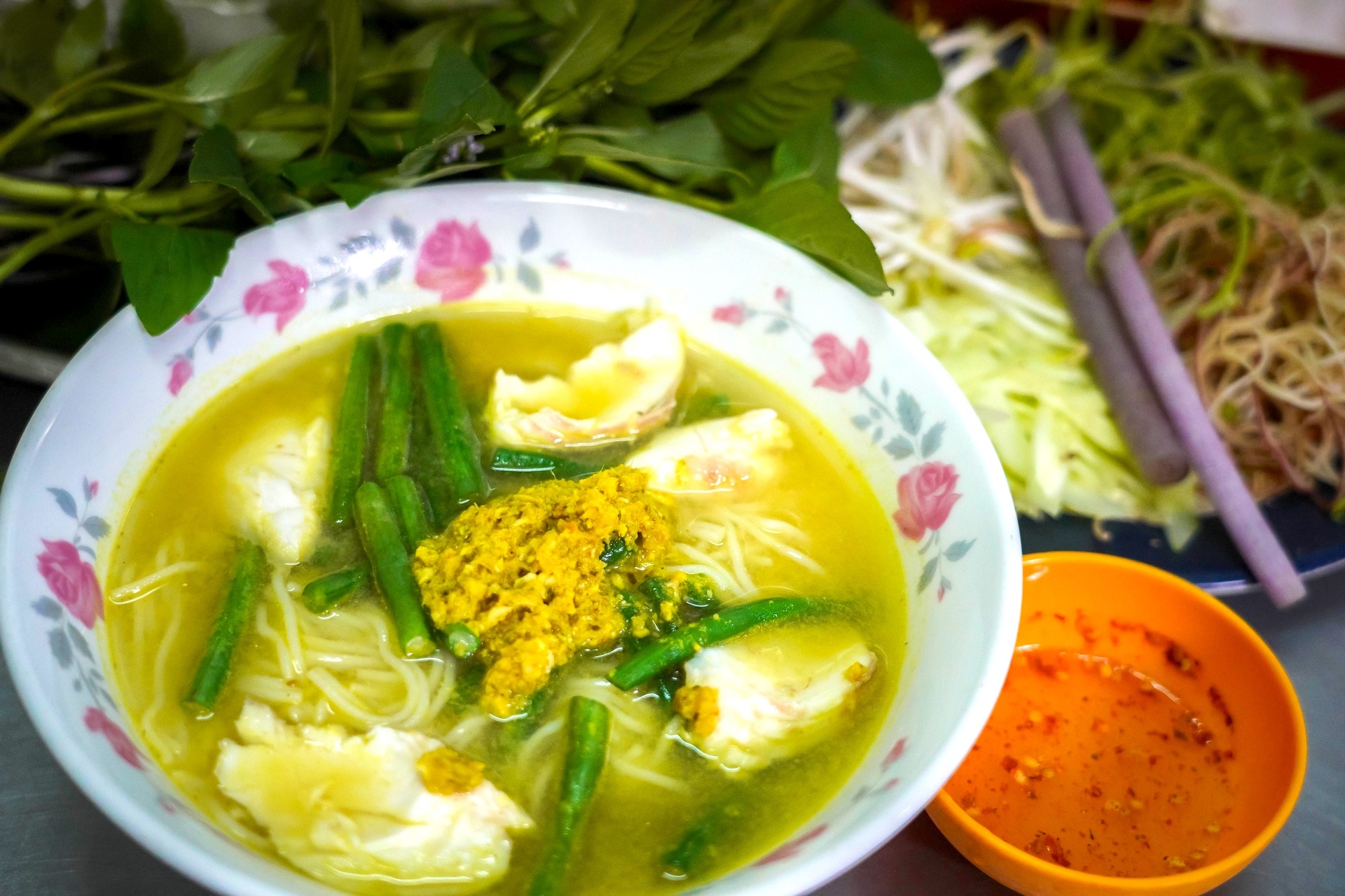 | Bún cá num-bo-chóc là một trong những đặc sản của Campuchia. Thành phần tạo hương vị đặc trưng của món này là mắm bò hóc, ngải bún và trái trúc. Điểm nhấn là nước dùng ngọt thanh quyện nghệ tươi giã nhuyễn tạo màu vàng bắt mắt, lôi cuốn vị giác. Ảnh: Chí Hùng. |