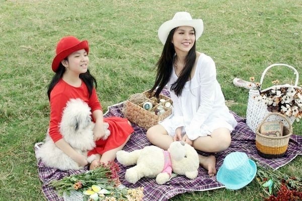 | Hiền Thục cùng con gái Gia Bảo đóng MV Cô bé bán sữa. |