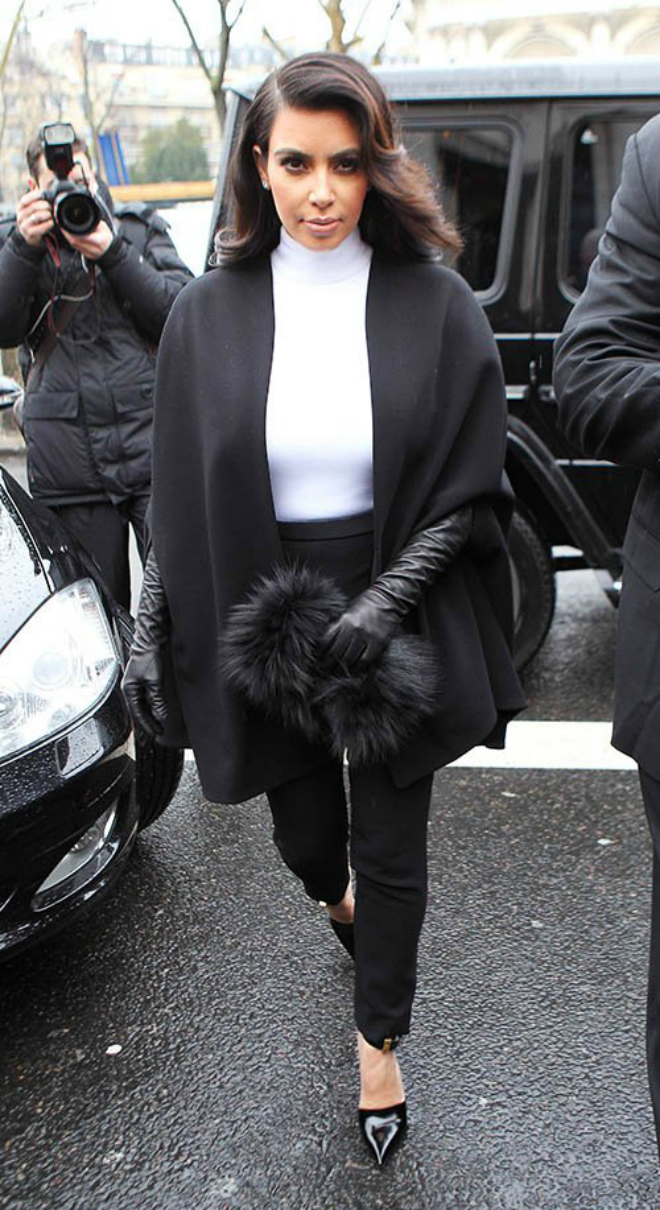 Kim Kardashian diện áo cổ lọ trắng tương phản với áo choàng cape tông đen, quần ống côn. Những phụ kiện như găng tay da, clutch lông thú được cô tận dụng triệt để nhằm thể hiện đẳng cấp thời trang của mình.