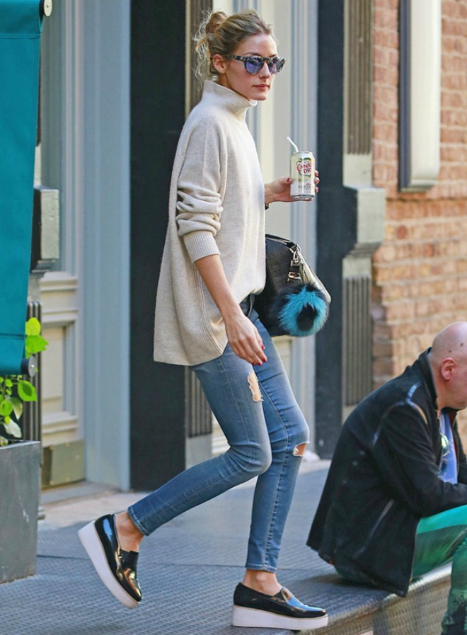| Set đồ năng động của Olivia Palermo với áo len cổ lọ, quần jeans và giày bánh mỳ. Túi xách có gắn móc treo bằng lông giúp trang phục của cô nàng thêm thú vị. |