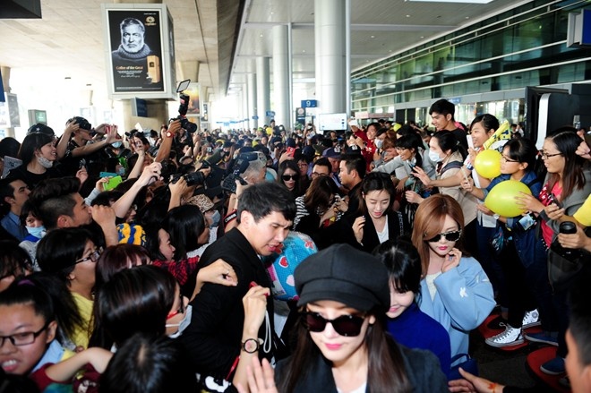 Sau 2PM và MissA, Sistar, sáng 22.03, các cô gái xinh đẹp của SNSD cũng đã có mặt tới Việt Nam. Fan hâm mộ của 9 cô gái cũng khó có dịp để "làm loạn" bởi nhóm di chuyển bằng cửa VIP và lên xe ngay lập tức. Thời tiết nắng nóng không là rào cản lớn đối với các bạn trẻ khi tình yêu dành cho nghệ sĩ có thể khiến họ bất chấp những rào cản ngôn ngữ. Tất cả đều tuân thủ theo quy định của các cơ quan an ninh và đứng dàn thành 2 hàng để cùng nhau hô vang tên của 9 thành viên SNSD.