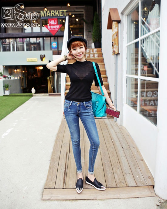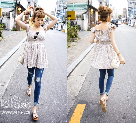 | Nếu quần jeans mix cùng áo phông đem lại nét khỏe khoắn thì quần jeans mix cùng áo kiểu cách điệu mang lại nét mềm mại hơn. |