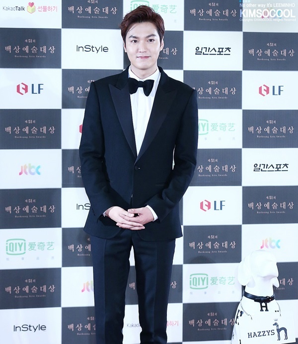 Xuất hiện trên thảm đỏ, Lee Min Ho khéo léo thắt nơ trên nền sơ mi trắng kèm bộ vest lịch lãm. |
