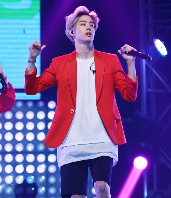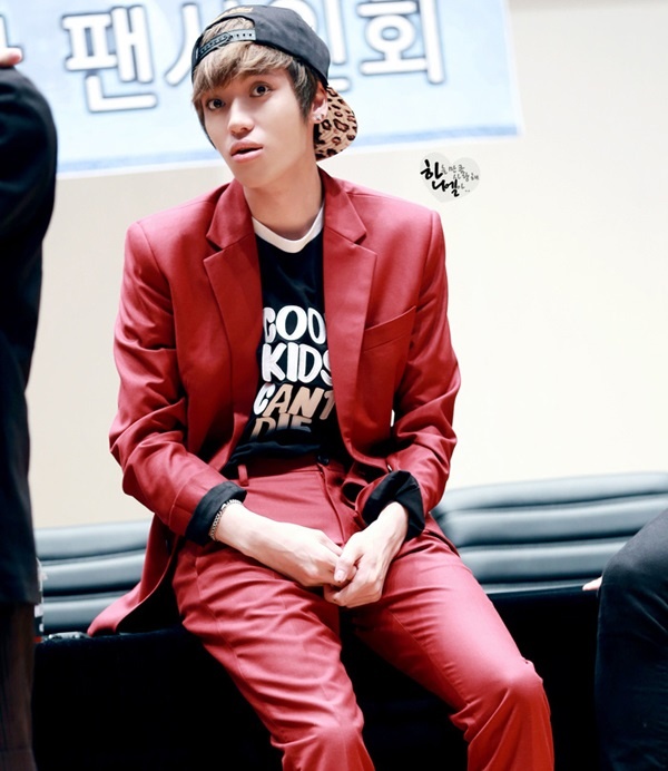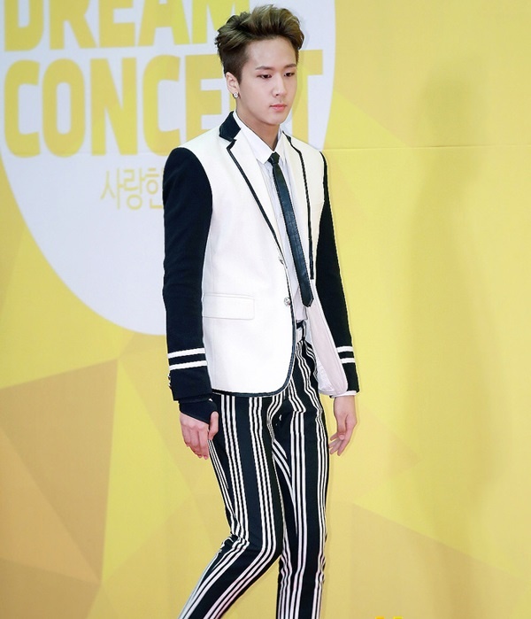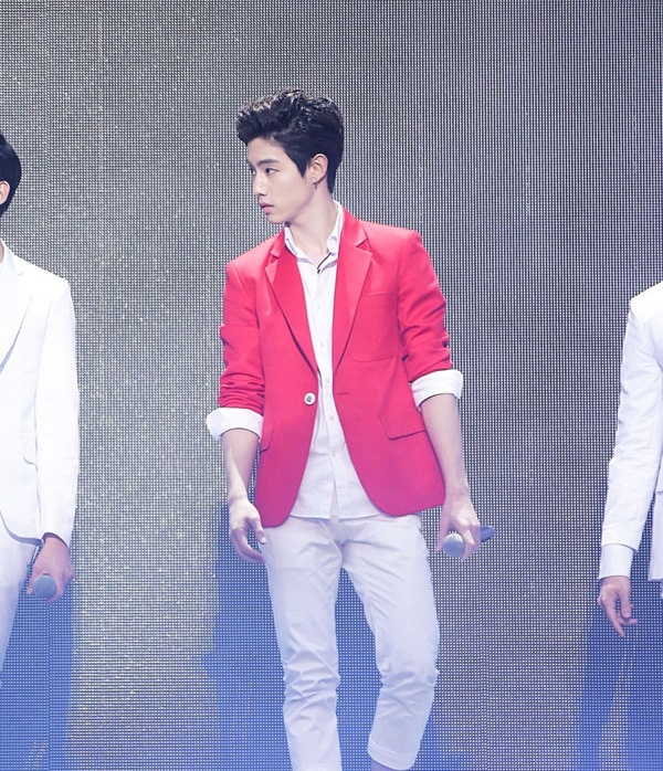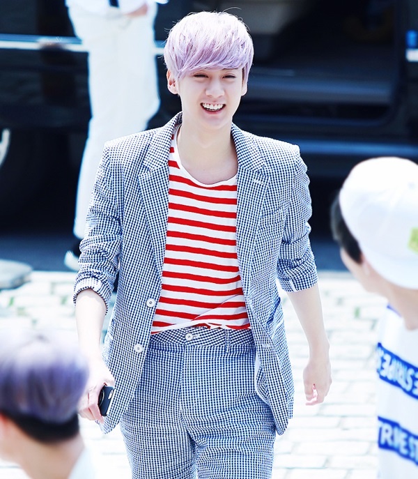 Chunji của Teen Top khéo léo khi kết hợp T-shirt kẻ ngang màu đỏ trắng nổi bật làm nền cho bộ vest đắt giá. |