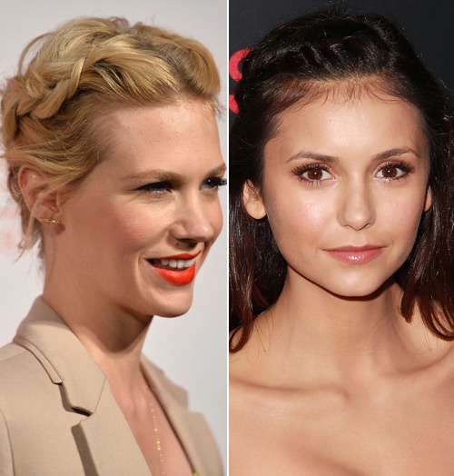 | Nếu như January Jones chọn kiểu chẻ đôi mái và tết song song để tăng vẻ mạnh mẽ thì Nina Dobrev vô cùng duyên dáng với phần tết mái lệch điệu đà. |
