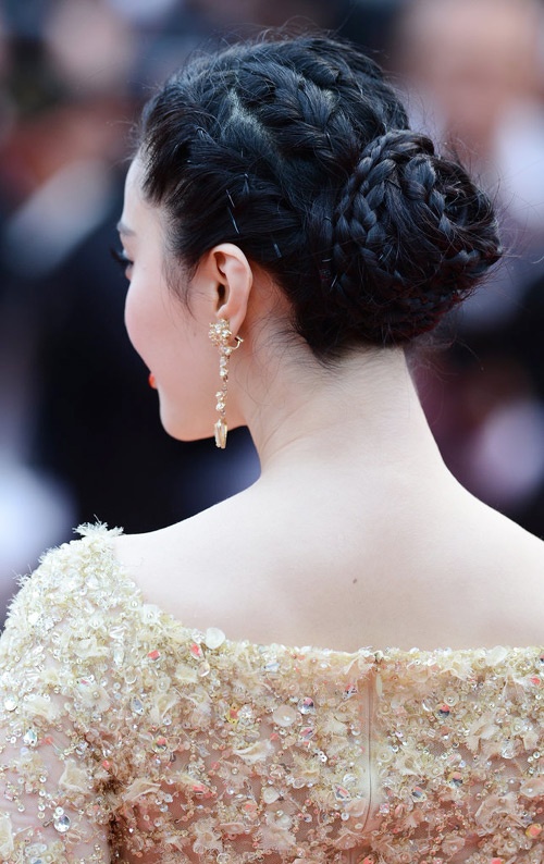 | Phạm Băng Băng với kiểu tóc tết búi ấn tượng khoe cổ cao nõn nà. |