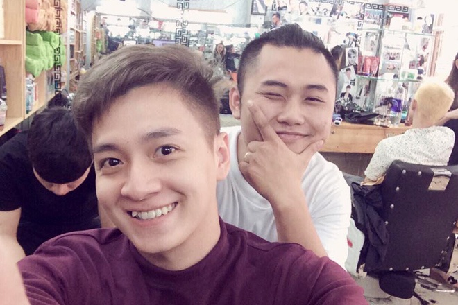 | Vũ Hoàng hiện làm việc trong một tiệm cắt tóc ở quận 3, TP HCM. Trong ảnh, 9X chụp ảnh cùng Ngô Kiến Huy sau khi cắt tóc cho nam ca sĩ. Ảnh: Vũ Hoàng. |