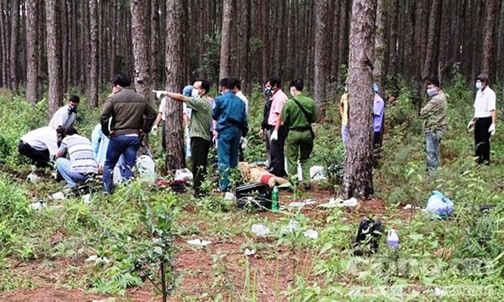 | Công an đưa Huy đến đồi thông nơi chôn xác tài xế Vinh để thực nghiệm hiện trường. Ảnh: CAND. |