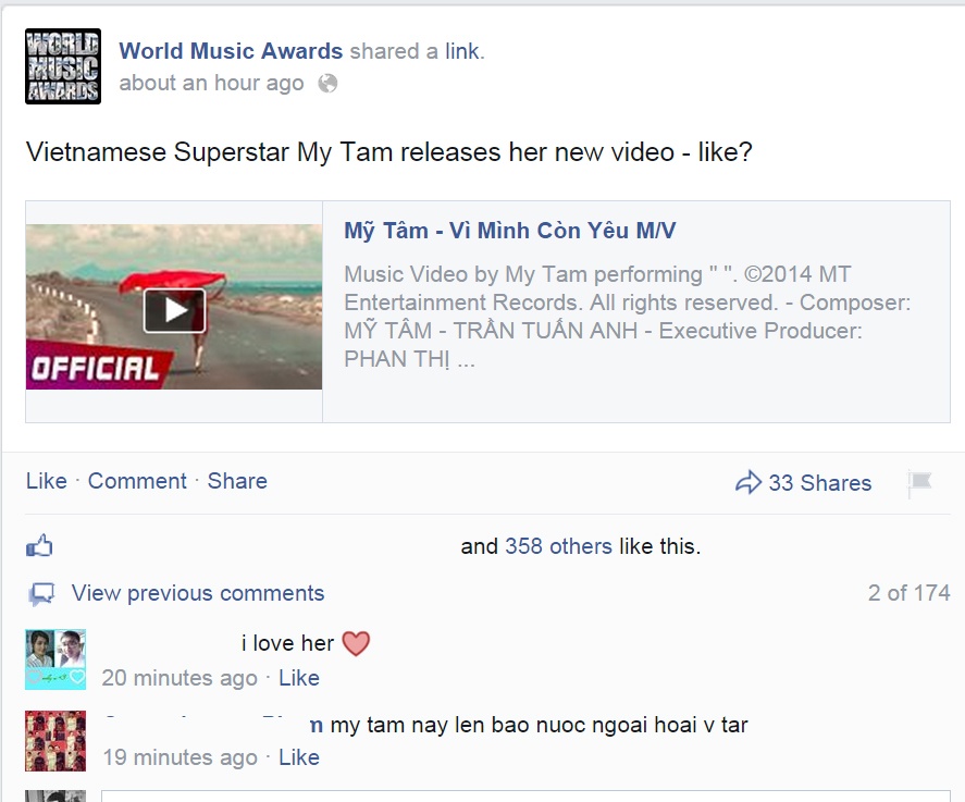 | MV mới của Mỹ Tâm được giới thiệu trên trang fanpage của giải thưởng World Music Awards. |